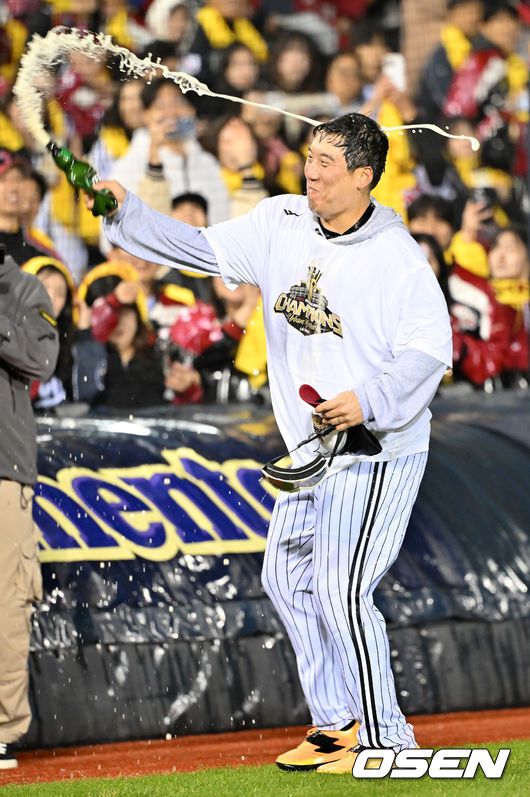 [OSEN=잠실, 민경훈 기자] 1일 오후 서울 잠실야구장에서 LG 트윈스의 한국시리즈 통합우승 IN 잠실' 행사가 열렸다. 팬들을 위한 트로피 퍼포먼스, 선수단 그라운드 행진, 비하인드 스몰토크, 선수단 샴페인 샤워 등 다양한 프로그램이 펼쳐진다. LG 김현수가 샴페인 샤워를 하고 있다. 2025.11.01 /rumi@osen.co.kr