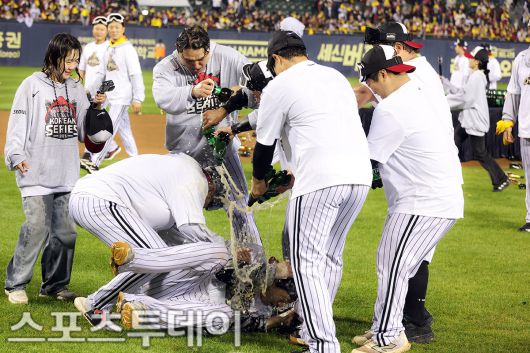 [스포츠투데이 안성후 기자] LG트윈스의 2025 한국시리즈 우승 세리머니가 1일 오후 서울 잠실야구장에서 열렸다. 이날 LG트윈스 임찬규가 샴페인 샤워를 하고 있다. 2025.11.01 [스포츠투데이 안성후 기자 sports@stoo.com]