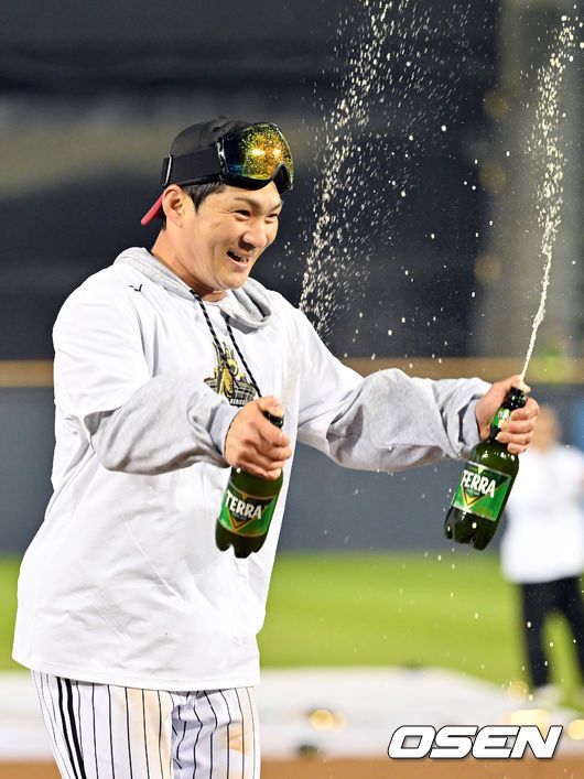 [OSEN=잠실, 민경훈 기자] 1일 오후 서울 잠실야구장에서 LG 트윈스의 한국시리즈 통합우승 IN 잠실' 행사가 열렸다. 팬들을 위한 트로피 퍼포먼스, 선수단 그라운드 행진, 비하인드 스몰토크, 선수단 샴페인 샤워 등 다양한 프로그램이 펼쳐진다. LG 오지환이 샴페인 샤워를 하고 있다. 2025.11.01 /rumi@osen.co.kr