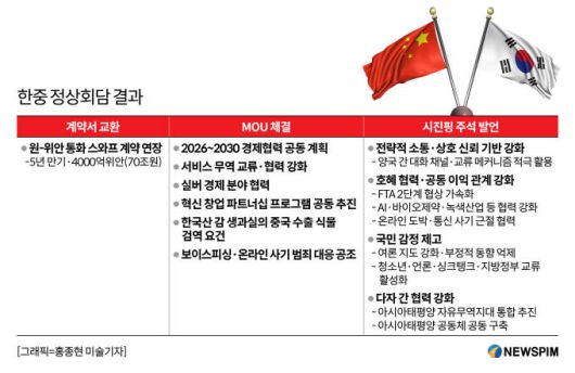 [세종=뉴스핌] 김기랑 기자 = 한국과 중국 양국이 정상회담을 계기로 70조원 규모의 원·위안 통화 스와프를 복원하고, 경제·민생 협력 채널을 재가동하기로 합의했다. 최근 몇 년간 경색돼 온 양국 관계가 상호 실익을 기반 삼아 점진적 회복 단계로 넘어가는 전환점을 마련했다는 평가가 나온다.
