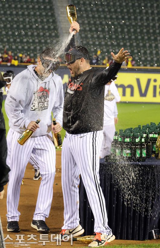 [스포츠투데이 안성후 기자] LG트윈스의 2025 한국시리즈 우승 세리머니가 1일 오후 서울 잠실야구장에서 열렸다. 이날 LG트윈스 오스틴이 샴페인 세리머니를 하고 있다. 2025.11.01 [스포츠투데이 안성후 기자 sports@stoo.com]