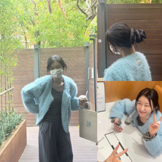 공개된 사진 속 채령은 스트라이프 티셔츠 위에 하늘색 니트 가디건을 매치하고, 카메라를 향해 다양한 포즈를 취하고 있다.