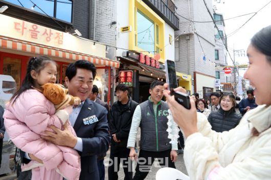 [이데일리 김태형 기자] 박준희 관악구청장이 1일 관악구 샤로수길에서 열린 ‘청년문화놀이터 그라운드 샤로수’ 축제에서 행사장을 찾은 어린이와 기념촬영을 하고 있다.