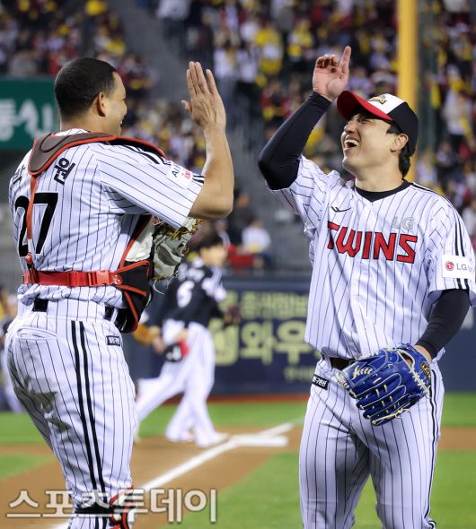 [스포츠투데이 안성후 기자] LG트윈스의 2025 한국시리즈 우승 세리머니가 1일 오후 서울 잠실야구장에서 열렸다. 이날 팬들을 위한 이벤트 경기에서 LG 박동원과 치리노스가 서로 역할을 바꿔 경기에 임하고 있다. 2025.11.01 [스포츠투데이 안성후 기자 sports@stoo.com]