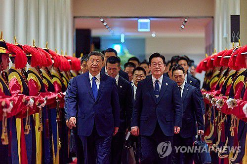 (경주=연합뉴스) 이재명 대통령과 시진핑 중국 국가주석이 1일 경북 경주 소노캄에서 열린 국빈만찬에 입장하고 있다. 2025.11.1 [대통령실 제공. 재판매 및 DB 금지]
