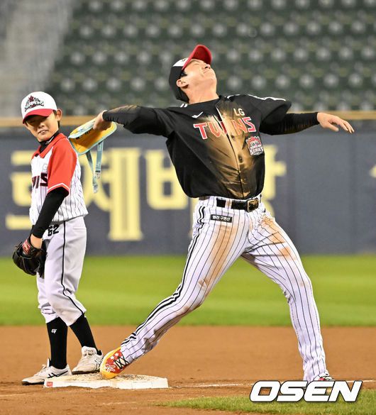 팬들을 위한 이벤트 경기에서 1루에 세이프 한 LG 오지환이 관중석으로 보호대를 던지고 있다. 2025.11.01 / rumi@osen.co.kr