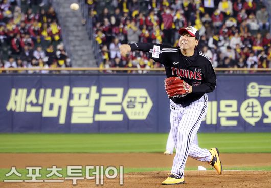 [스포츠투데이 안성후 기자] LG트윈스의 2025 한국시리즈 우승 세리머니가 1일 오후 서울 잠실야구장에서 열렸다. 이날 팬들을 위한 이벤트 경기에서 LG 김현수 선수가 강속구를 뿌리고 있다. 2025.11.01 [스포츠투데이 안성후 기자 sports@stoo.com]