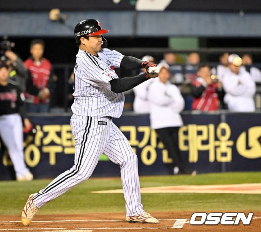 팬들을 위한 이벤트 경기에서 타자로 나온 LG 투수 장현식이 타석에서 타격을 하고 있다 2025.11.01 / rumi@osen.co.kr