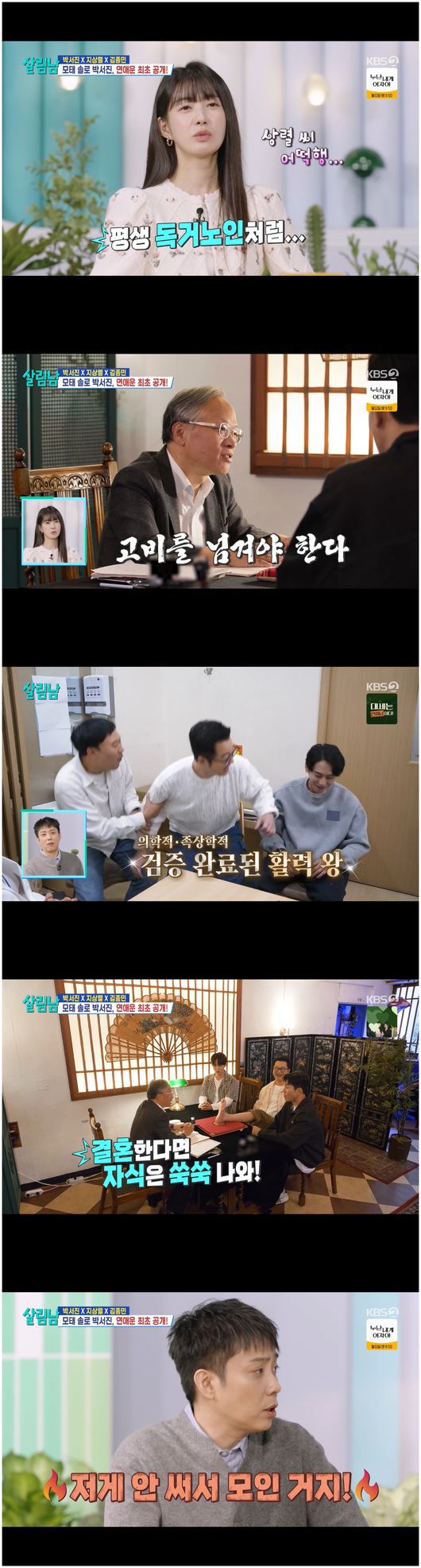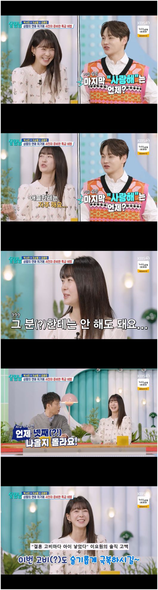 박서진은 “저는 실연을 당해본 적이 없어서 그런지 실연하면 그렇게 된다고 생각했다”라며 모태 솔로다운 발언을 했다. 김종민은 “상렬이 형이 안 좋은 일이 있다고, 쫑났다고 해서 달려왔다”라며 결혼한 사람답게 지상렬에게 많은 표현과 감정을 설명하라고 조언했다. 지상렬과 박서진은 그 말에 이해를 하지 못했다. 이요원은 "사랑한다는 말을 많이 하는 게 좋다", "나는 그분(남편)에게는 이제는 안 한다"라며 어쨌든 사랑한다는 표현을 하라고 말했다.