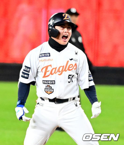 [OSEN=대전, 지형준 기자] 30일 대전 한화생명볼파크에서 2025 신한 SOL Bank KBO리그 포스트시즌 한국시리즈 4차전 한화 이글스와 LG 트윈스의 경기가 열렸다.이날 경기에 한화는 와이스를, LG는 치리노스를 선발투수로 내세웠다. 7회말 2사 2,3루에서 한화 문현빈이 2타점 중전 적시타를 날리며 기뻐하고 있다. 2025.10.30 / jpnews@osen.co.kr |