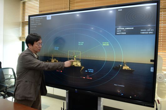 ETRI 연구진이 개발한 인공지능 응용SW 개발 프레임워크 ‘탱고 MLOps’의 자율운행선박 시뮬레이션 결과를 시연하고 있다.[ETRI 제공] |