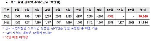 실제로 <케데헌>이 공개된 후인 하반기에 뮷즈 매출이 큰 폭으로 증가했다. 올해 1~3월 뮷즈 매출은 월별 10억대, 4~6월은 월별 20억대를 기록했다. 7월 매출은 49억5700만원으로 전월 대비 2배 이상 상승했다. 8월에는 2025년 월별 최고치인 52억7600만원을 달성했고, 9월과 10월에도 40억대의 판매액이 발생했다.