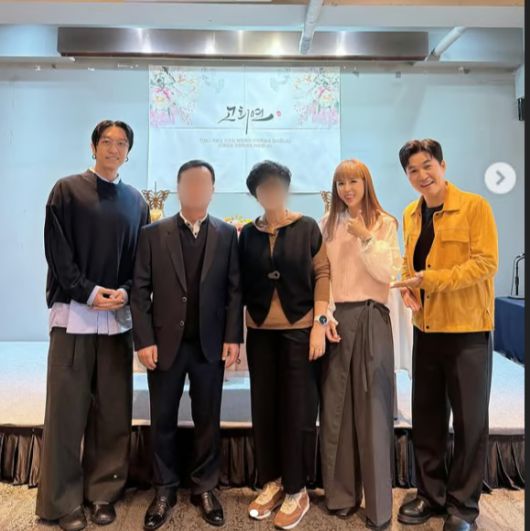 공개된 사진에는 신지와 그의 부모님이 서 있으며 양끝에는 빽가와 김종민이 자리하고 있다.