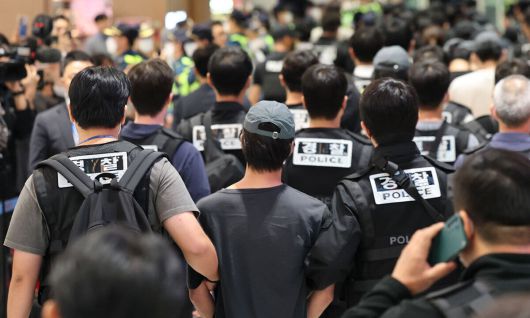 캄보디아 온라인 사기에 가담해 구금된 한국인들이 18일 오전 인천국제공항 제2터미널을 통해 송환되고 있다. 공동취재 |