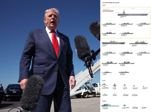 도널드 트럼프 미국 대통령이 10월 31일(현지시간) 플로리다주 웨스트팜비치 국제공항에 도착해 기자들에게 발언하고 있다. 오른쪽은 워싱턴포스트(WP)가 공개한 미군의 카리브해 배치 전력 인포그래픽으로 항공모함 USS 제럴드 R. 포드를 비롯한 해군·공군 자산이 포함됐다. AFP 연합뉴스·WP 그래픽 재구성 |