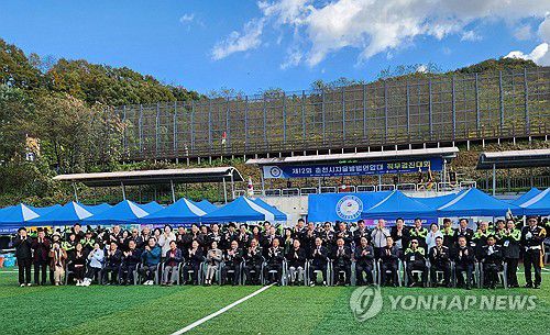 (춘천=연합뉴스) 2일 강원 춘천시 송암스포츠타운에서 열린 춘천시자율방범연합대 직무경진대회에서 박상경 춘천경찰서장이 대원들에게 감사장을 수여한 뒤 기념 촬영하고 있다. 2025.11.2 [춘천경찰서 제공. 재판매 및 DB 금지]
