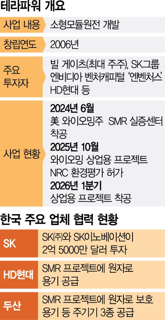아울러 영국에서는 최근 원자로 설계 승인을 신청하는 등 시장 진출을 위한 본격적인 절차를 밟고 있고 그다음 차례로 한국 시장에 진출하겠다는 뜻을 밝혔다. 그는 “미국에서 처음으로 (차세대 원전을) 배치하는 것을 생각하고 있다”며 “그다음으로는 영국과 한국을 가장 큰 수출처로 고려하고 있다”고 말했다. 그는 한국을 잠재 수출 시장뿐 아니라 테라파워의 SMR 제조 공급망의 핵심 파트너라고 강조했다. SK(034730)는 2022년 SK㈜와 SK이노베이션(096770)을 통해 2억 5000만 달러를 투자해 빌 게이츠에 이어 2대 주주에 올랐다. HD현대(267250)와 두산(000150)은 SMR 주기기를 제작해 납품하고 있다. HD현대는 올해 6월 테라파워가 6억 5000만 달러의 자금을 조달할 때 엔비디아의 벤처캐피털과 함께 투자자로 참여했다. 그는 “한국은 원자력 공급망 부분에서 훌륭한 역량을 갖추고 있다”며 “테라파워 생태계에서도 큰 역할을 하고 있다”고 강조했다. 실제로 와이오밍주의 데모 플랜트 공사에는 HD현대중공업(329180)과 두산에너빌리티(034020) 등 국내 기업과 협업하고 있다.