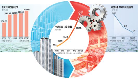 가계대출의 부동산 쏠림은 더 심각하다. 한은에 따르면 주택담보대출이 전체 가계 신용에서 차지하는 비중은 2007년 말 51.7%에서 2024년 말 58.4%로 확대됐다. 주담대는 주택을 담보로 삼아 은행 입장에서 가장 안전한 대출 중 하나로 꼽힌다. 금융감독원은 국내 은행의 가계·기업 부동산 관련 대출이 지난해 말 기준 1673조 8000억 원으로 2019년 말(1167조 원)과 비교해 43.4% 증가했다고 추산하기도 했다. 이 중 가계 부문 부동산 담보가 총 771조 3000억 원으로 전체의 46.1%를 차지한다.