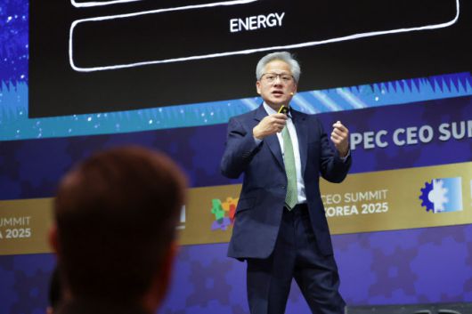 젠슨 황 엔비디아 최고경영자(CEO)가 지난달 31일 경북 경주 예술의전당에서 열린 아시아태평양경제협력체(APEC) 최고경영자(CEO) 서밋 특별 세션에서 연설하고 있다.(사진=연합뉴스) |
