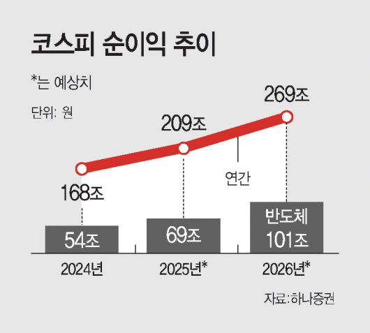 코스피 지수가 4100선을 넘으며 사상 최고치를 기록 중인 가운데 내년도 반도체 업종의 순이익 비중이 더 커질 것이란 전망이 나온다. AI(인공지능) 투자 확대로 메모리 시장이 커지면서 반도체 기업들의 순익도 늘어날 것이란 분석이다. 실제 코스피 시가총액 1위와 2위인 삼성전자, SK하이닉스의 실적 증가와 주가 상승이 코스피 지수를 끌어올리면서 반도체 기업의 순익 비중이 코스피 상장기업의 3분의 1을 차지할 것으로 예상된다.
