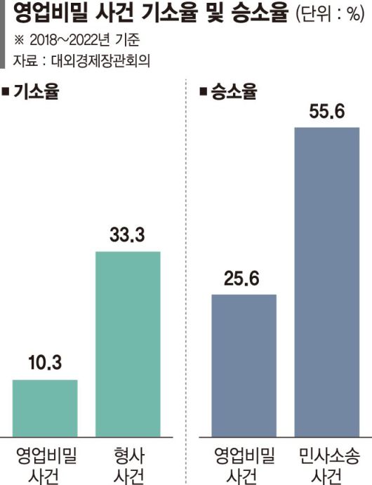 기술 유출이 국가 경쟁력을 위협하는 수준으로 확산되고 있지만 대응은 여전히 미흡하다는 지적이 따른다. 우선 영업비밀 침해 등 기술침해 사건의 기소율은 일반 형사사건에 비해 현저히 낮다. 또 현행 산업기술보호법은 국가 핵심기술을 유출하면 3년 이상의 징역과 최대 65억원의 벌금형에 처하도록 하지만, 실제 처벌 수준은 규정에 미치지 못하고, 부정경쟁방지법 위반(10년 이하의 징역 또는 1억원 이하의 벌금형) 등 낮은 형량이 적용돼 벌금형이나 집행유예로 끝나는 경우가 많다는 해석이다.