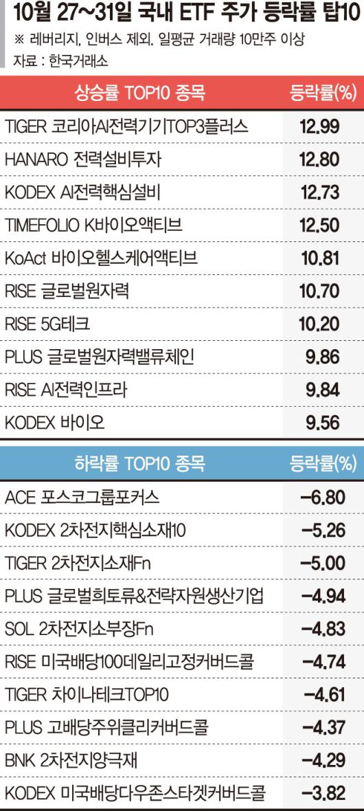 2일 한국거래소에 따르면 지난달 27일부터 31일까지 국내 ETF 시장에서 가장 높은 수익률을 기록한 종목은 'TIGER 코리아AI전력기기TOP3플러스'로 12.99% 급등했다. 이어 'HANARO 전력설비투자'가 12.80%, 'KODEX AI전력핵심설비'가 12.73% 상승하며 AI 전력설비 관련 ETF가 상위권을 석권했다. 레버리지 및 인버스 종목과 일평균 거래량 10만주 미만 종목을 제외한 기준이다.