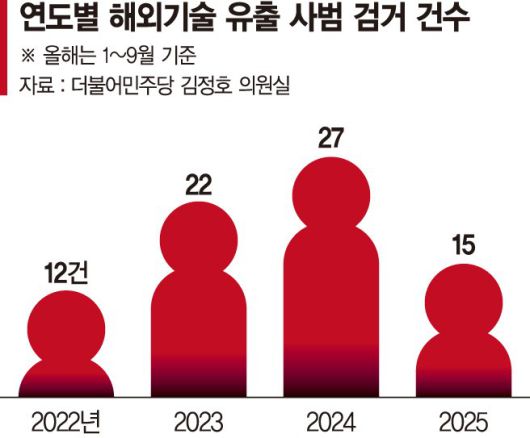 2일 국회 산업통상자원중소벤처기업위원회 소속 김정호 더불어민주당 의원실이 경찰청으로부터 제출받은 '최근 3년간 해외 기술 유출 사범 검거 현황(검찰 송치 기준)' 자료에 따르면, 올해 3·4분기까지 해외 기술유출 사건이 총 15건 적발됐다. 올해 상반기(1~6월 기준) 8건에 그쳤던 기술유출 사건은 불과 1분기 만에 7건이 늘었다. 업계에서는 인공지능(AI) 반도체, 이차전지 등 차세대 산업 경쟁이 치열해지면서 해외 기업들이 기술 확보에 사활을 걸고 있기 때문이라는 분석이 나온다. 해외 기술유출 사범 검거건수는 연간 2022년 12건에서 지난해 27건으로 두 배 이상 증가하며, 기술유출이 더욱 빠른 속도로 확산하고 있다는 우려가 제기된다.