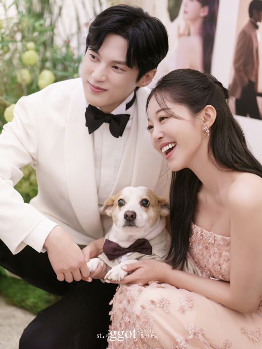 사진 속에는 결혼반지를 낀 손을 자랑하는 윤선우 김가은의 모습이 담겨 있다. 반려견과 함께 활짝 웃는 사진에서는 행복함이 묻어난다.