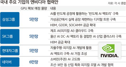 정부는 GPU 1만5000장을 추가 구매하기 위해 내년 예산 2조원을 확보하고, 2028년까지 5만장, 2030년까지 20만장을 확보한다는 목표를 세울 만큼 GPU 확보가 절실했다. GPU 확보 경쟁에서 밀리면 AI 산업이 뒤처질 수 있다는 우려에서다. 이런 상황에 젠슨 황 엔비디아 최고경영자(CEO)가 방한해 경쟁국보다 월등히 많은 물량을 약속하면서 걱정을 한시름 덜게 됐다. 엔비디아는 앞서 영국에 12만장, 유럽연합(EU)에 10만장을 공급하기로 밝힌 바 있다.