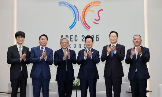 기념 촬영 이재명 대통령이 지난달 31일 경북 경주화백컨벤션센터(HICO)에서 젠슨 황 엔비디아 대표를 만난 뒤 참석자들과 기념 촬영을 하며 박수를 치고 있다. 사진 왼쪽부터 이해진 네이버 이사회 의장, 최태원 SK그룹 회장, 황 대표, 이 대통령, 이재용 삼성전자 회장, 정의선 현대자동차그룹 회장. 경주=남정탁 기자 |