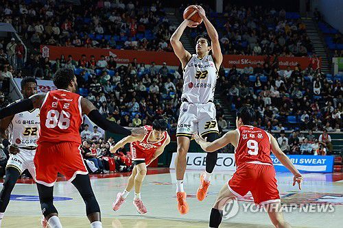 (서울=연합뉴스) 신현우 기자 = 2일 서울 잠실학생체육관에서 열린 2025-2026 LG전자 프로농구 정규리그 서울 SK와 창원 LG의 경기. LG 칼 타마요가 슛하고 있다. 2025.11.2