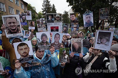 전쟁포로 사진 들고 있는 우크라이나 시민들 |
