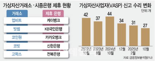 FIU에 따르면 올해 10월 기준 신고 수리를 마친 VASP는 27곳으로, 전년(44곳) 대비 급감했다. 이 가운데 코인마켓 거래소는 플라이빗·포블·코어닥스 등이 남아 있으나, 실제 활발히 거래되는 곳은 많지 않다. 한 거래소 관계자는 “최근 여러 은행과 실명계좌 계약을 논의 중”이라며 “사실상 주요 은행은 모두 접촉했다”고 말했다.