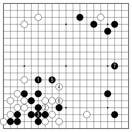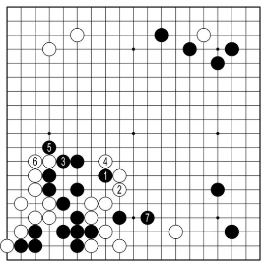 ◆실전 진행=실전부터 본다. 장고했으나 결국 흑1로 뛰어나가는 정도였다. 백은 2, 4, 6으로 정비했고 흑은 7의 큰 곳으로 손을 돌렸다. AI는 이 장면에서 백 3집반 우세라고 판정한다. 흑이 도망치느라 바빠 하변 백진을 공략하지 못했다는 점을 AI는 크게 보고 있다.