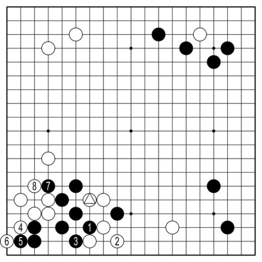 ◆AI의 선택=AI는 흑1의 붙임수를 타개의 급소로 내세운다. 수순을 따라가다 보면 흑은 어느덧 타개가 되어 있고 7로 하변마저 삭감하고 있다. 하나 흑1이 쉬운가. 흑1 같은 맥은 인간도 두긴 한다. 그러나 이 수를 최선이라고 확신하는 것은 돌의 효능을 온몸으로 체득한 자만이 가능하다.