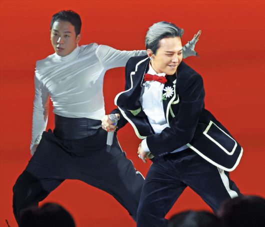 연합뉴스APEC 만찬 들썩이게 한 지드래곤 가수 지드래곤(오른쪽)이 지난 31일 경북 경주시 라한셀렉트호텔에서 열린 APEC 정상회의 환영 만찬에서 공연하고 있다. 각국 정상은 스마트폰으로 영상을 찍었고, 만찬이 끝난 이후 소셜미디어 등을 통해 자국민들에게 현장 분위기를 전했다. |