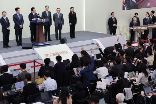 이재명 대통령이 1일 경주화백컨벤션센터(HICO)에서 2025 아시아태평양경제협력체(APEC) 정상회의 기자회견을 하고 있다. 연합뉴스 |