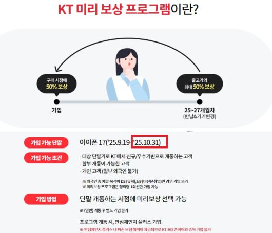 3일 업계에 따르면 KT는 아이폰17에 대한 미리보상 프로그램 가입 기간을 당초 공지했던 11월 30일에서 지난달 31일로 한 달 앞당기기로 결정했다.