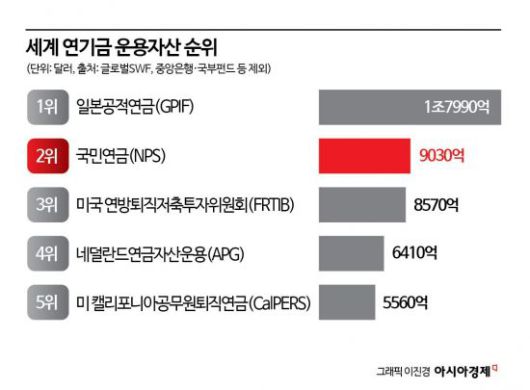 세계 연기금 시장에서도 최상위권 규모다. 세계 연기금 평가기관인 글로벌 SWF에 따르면 운용자산 기준 국민연금의 덩치는 일본공적연금(GPIF)에 이어 세계 2위다.