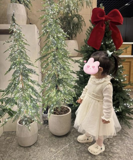 사진 속 서이 양은 크리스마스 트리 앞에 서 있는 모습이다.