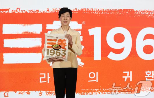 3일 오전 서울 중구 보코 서울 명동 호텔에서 열린 '삼양 1963' 신제품 출시 발표회에서 김정수 삼양식품 부회장이 제품을 들고 포즈를 취하고 있다. '삼양 1963'은 면을 튀기는 기름으로 팜유 대신 우지를 사용하고 소뼈로 우려낸 액상 스프까지 더해 국물 풍미를 끌어올린 것이 특징으로, 삼양식품은 36년 전 ‘우지(牛脂·소기름) 파동’으로 사라진 대한민국 1호 라면를 재출시하며 명예회복에 나선다. 2025.11.3/뉴스1 ⓒ News1 오대일 기자 |