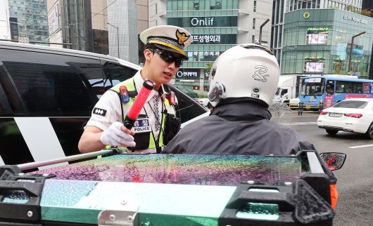 지난 7월 서울 강남구 강남역 사거리에서 경찰이 5대 반칙 운전과 이륜차 무질서 운행을 단속하고 있다. [연합] |