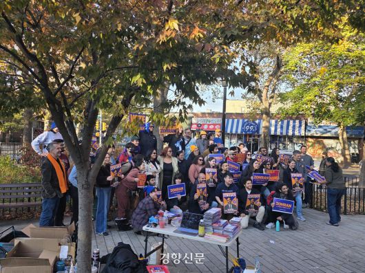 미국 뉴욕시장 선거 사전투표 마지막 날인 2일(현지시간) 오후 뉴욕 퀸스의 한 놀이터에 수십명의 사람이 모여들었다. 모두 조란 맘다니 민주당 뉴욕시장 후보의 거리 유세에 참여하겠다고 신청한 자원봉사자들이다. 이들이 오늘 할 일은 집집마다 돌아다니며 맘다니 후보의 정책을 설명하고 사전 투표가 마감되기 전 그에게 한 표를 행사해 달라고 호소하는 것이다.