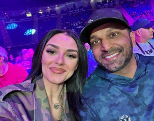 25일(현지시간) 펜실베이니아주 스테이트칼리지에서 열린 프로레슬링 대회를 방문한 캐시 파텔(45·오른쪽) 미국 연방수사국(FBI) 국장과 여자친구인 컨트리가수 알렉시스 윌킨스(26). 2025.10.25 윌킨스 엑스 |