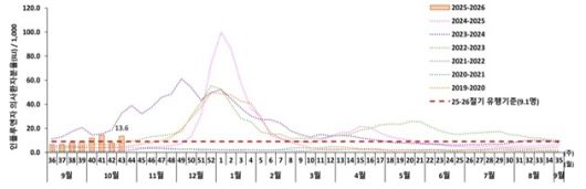 질병청은 작년 10월보다 환자가 많이 발생한 데다 남반구에서의 발생 상황을 고려했을 때 이번 동절기(2025∼2026절기) 인플루엔자 유행이 지난 10년간 독감이 가장 유행했던 2024~25절기와 비슷한 수준으로 확산하고 유행 기간도 길어질 것으로 내다봤다.