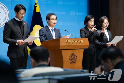 (서울=뉴스1) 유승관 기자 = 더불어민주당 정치검찰 조작기소대응 특별위원회 소속 의원들이 3일 서울 여의도 국회 소통관에서 정진상 전 민주당 당대표실 정무조정실장에 대한 검찰 수사 관련 언론보도 등에 대해 기자회견을 하고 있다. 왼쪽부터 한준호 위원장, 이건태, 이주희 의원. 2025.11.3/뉴스1