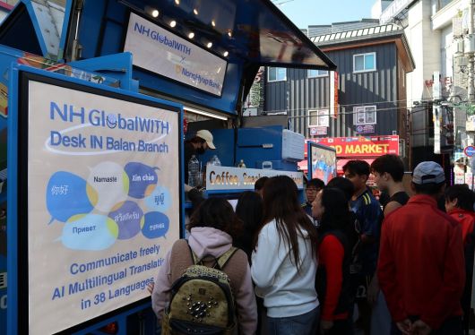 NH농협은행은 외국인 근로자가 많은 화성의 지역적 특성을 반영해 AI로 38개 언어를 실시간으로 통번역하는 'NH글로벌위드 데스크'와 외국인 전용상품 'NH글로벌위드 통장·적금·체크카드 패키지'를 소개했다.