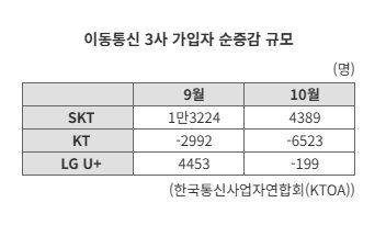 3일 한국통신사업자연합회(KTOA)에 따르면 지난달 전체 번호이동자 수는 총 60만66명으로 지난 9월(64만3875명) 대비 6.8% 줄었다. 전체 번호이동 시장은 지난 SKT 해킹 사고 이후 지난 5월과 7월에 90만명대였지만 8월부터 60만명 대로 안정세를 찾았다.