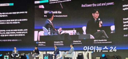 김창규 메타 수석엔지니어가 3일 서울 강남구 코엑스 'SK AI 서밋' 세션 무대에 올라 발언하는 모습.(아래, 왼쪽부터) 필립 웡 TSMC 수석 과학자, 김창규 메타 수석엔지니어, 찰스 판 멤버지 창업자, 김호식 SK하이닉스 부사장. [사진=박지은 기자] |