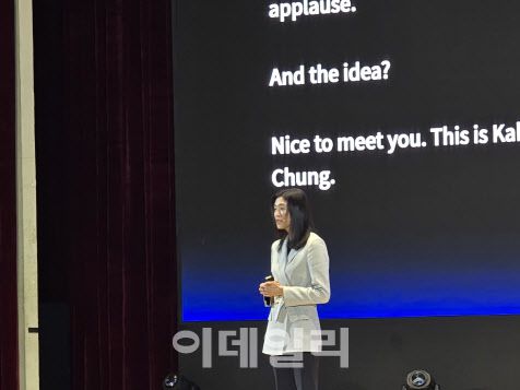정신아 카카오 대표가 3일 ‘SK AI 서밋 2025’에서 발표하고 있다(사진=윤정훈 기자) |